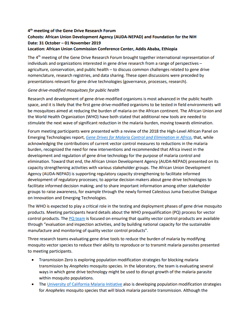 The 4th meeting of the Gene Drive Research Forum brought together international representation of individuals and organizations interested in gene drive research from a range of perspectives – agriculture, conservation, and public health – to discuss common challenges related to gene drive nomenclature, research registries, and data sharing. These open discussions were preceded by presentations relevant for gene drive technologies (governance, processes, research).