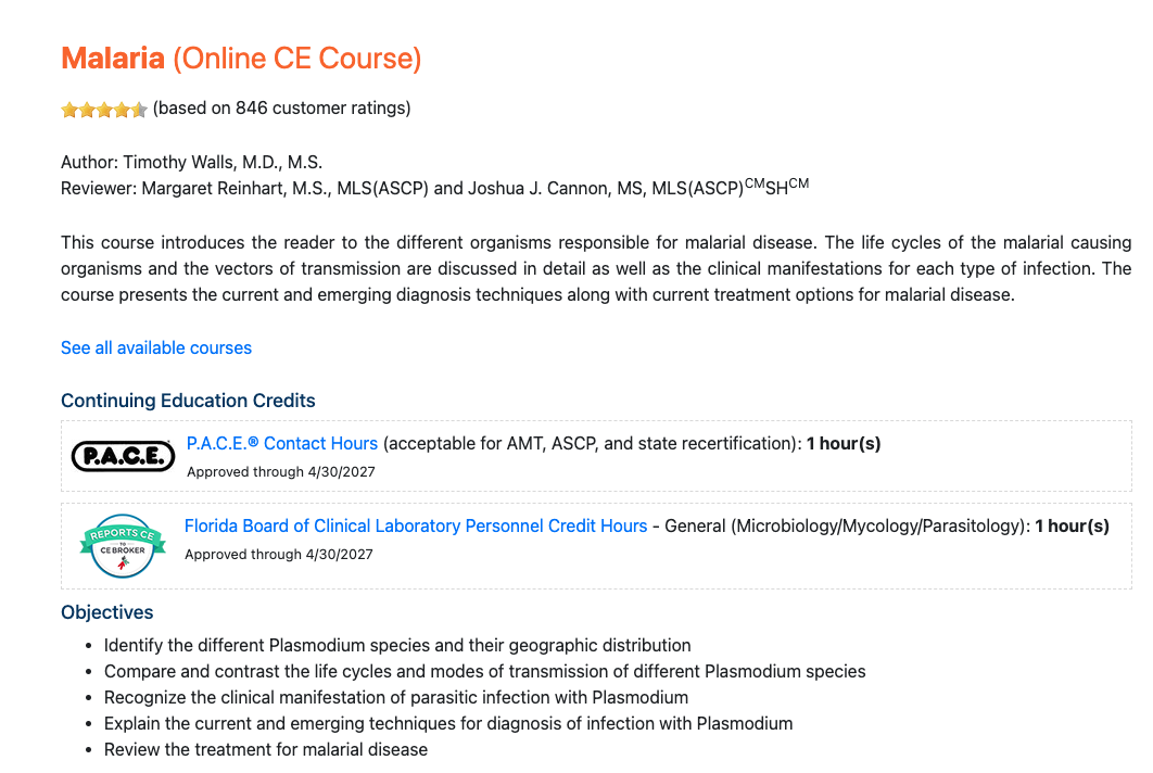 This online course introduces the reader to the different organisms responsible for malarial disease. The life cycles of the malarial causing organisms and the vectors of transmission are discussed in detail as well as the clinical manifestations for each type of infection. The course presents the current and emerging diagnosis techniques along with current treatment options for malarial disease.