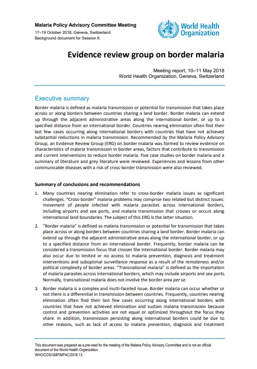 Border malaria is defined as malaria transmission or potential for transmission that takes place across or along borders between countries sharing a land border. Border malaria can extend up through the adjacent administrative areas along the international border, or up to a specified distance from an international border. Countries nearing elimination often find their last few cases occurring along international borders with countries that have not achieved substantial reductions in malaria transmission. Recommended by the Malaria Policy Advisory Group (MPAC), an Evidence Review Group (ERG) on border malaria was formed to review evidence on characteristics of malaria transmission in border areas, factors that contribute to transmission and current interventions to reduce border malaria. Five case studies on border malaria and a summary of literature and grey literature were reviewed. Experiences and lessons from other communicable diseases with a risk of cross-border transmission were also reviewed.